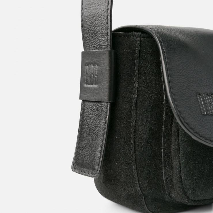Bolso bandolera elaborado en piel lavada y serraje. Bandolera regulable. Cierre con solapa e iman. Multiples bolsillos externos e internos. Forro de algodón. Medidas 19 x 14 x 6 cm
