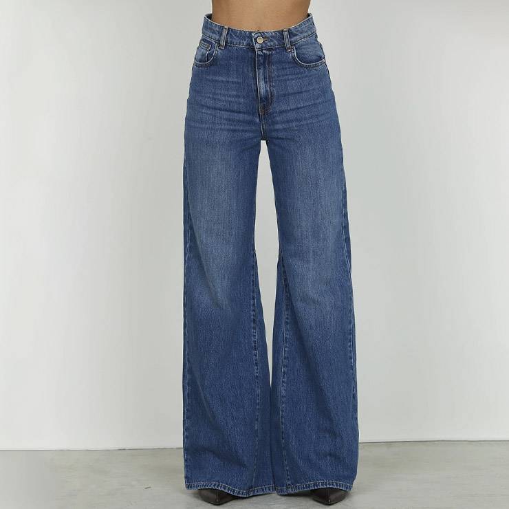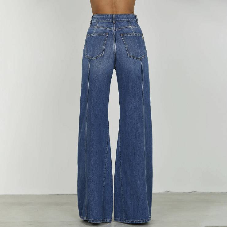 Pantalón acampanado tipo jeans de algodón 100%. Tiro alto. Cinco bolsillos. Detalle costura nervio en la parte trasera. Cierre botón y cremallera.