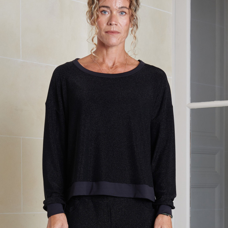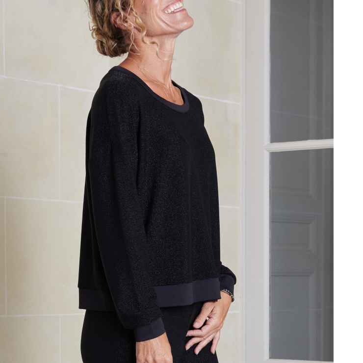 Jersey tipo sudadera de poliamida y lurex. Manga larga y cuello redondo. Corte recto.