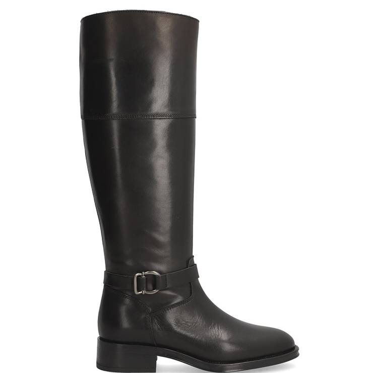 Bota plana de piel estilo Riding boots. Adorno metálico en el tobillo. Cierre mediante cremallera lateral. Suela de goma flexible de gran comodidad.
