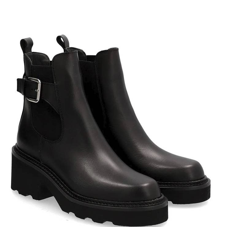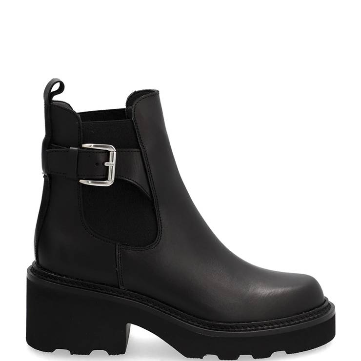 Botín elaborado en piel. Detalle de hebilla decorativa y elásticos en los laterales. Suela de goma antideslizante con tacón ancho de 6 cm.