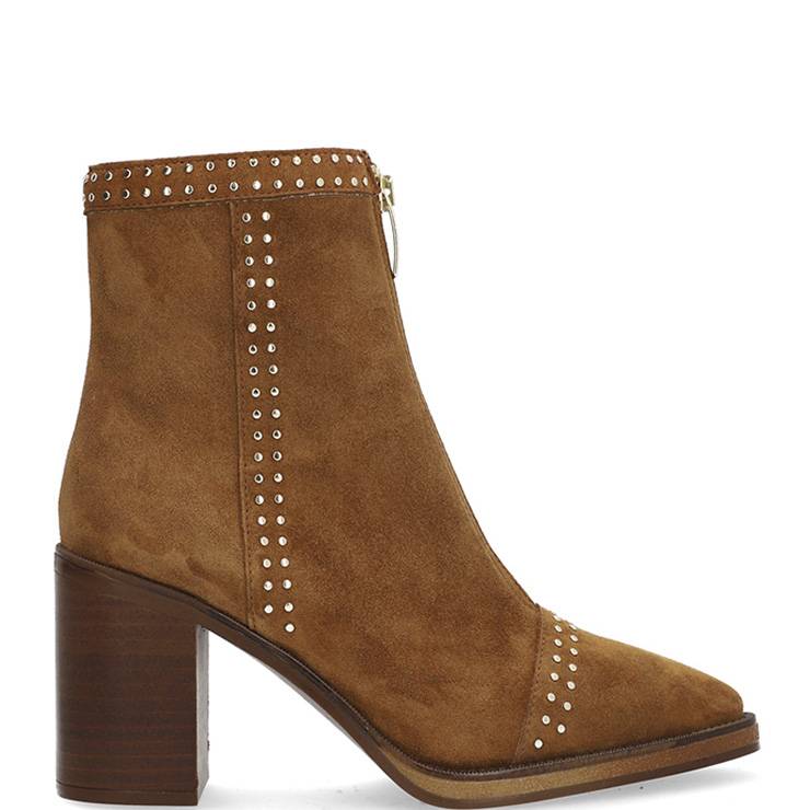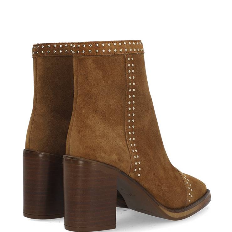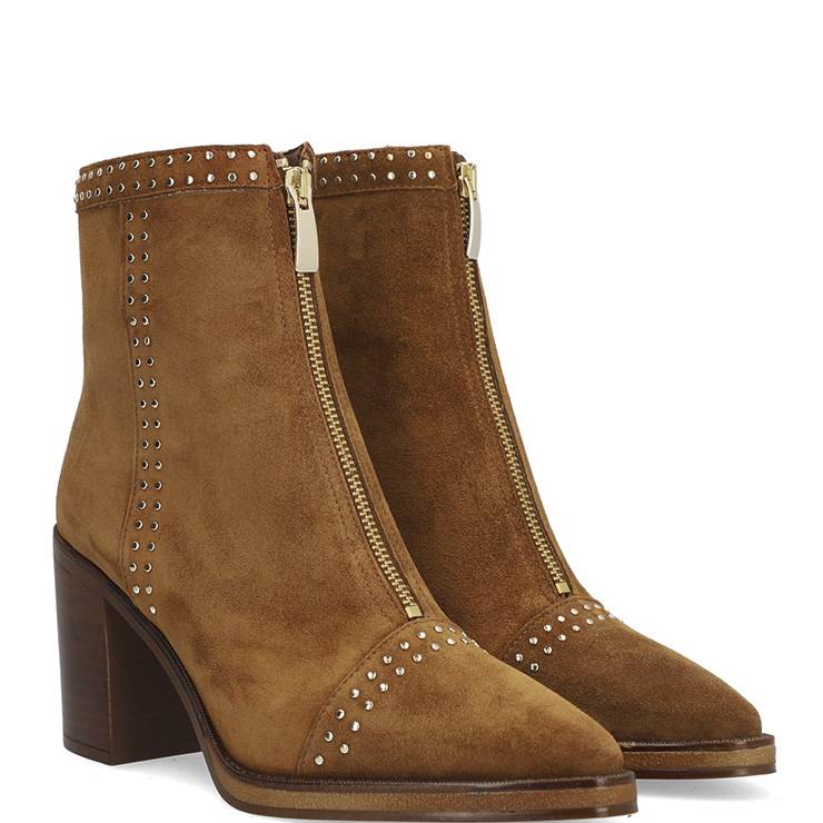 Botín elaborado en ante. Tacón bloque de 8 cm. Cierre cremallera frontal. Detalle de mini tachuelas