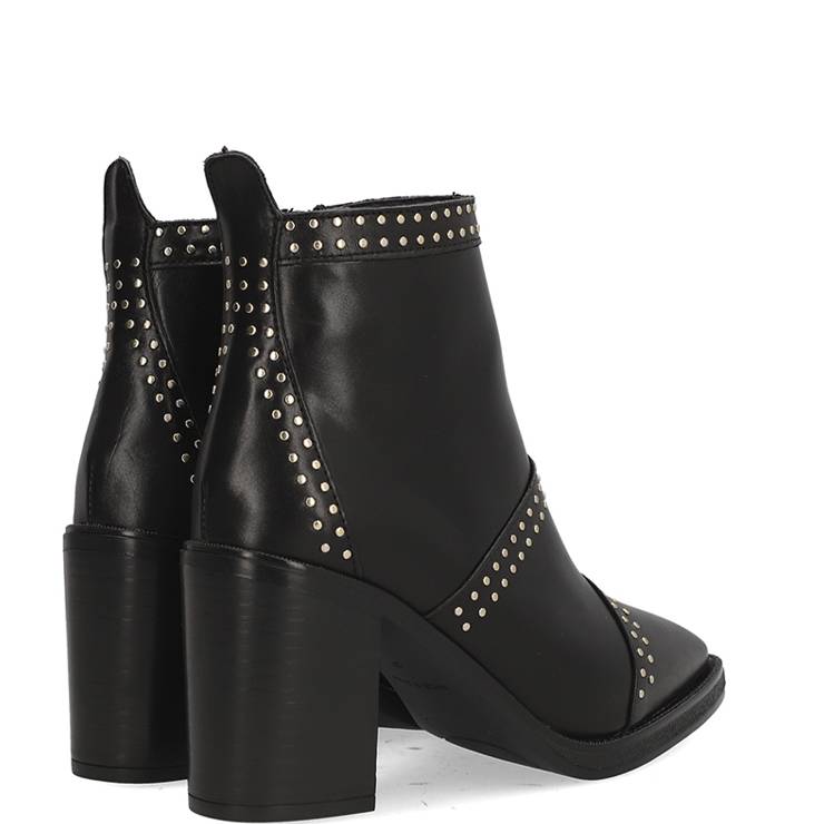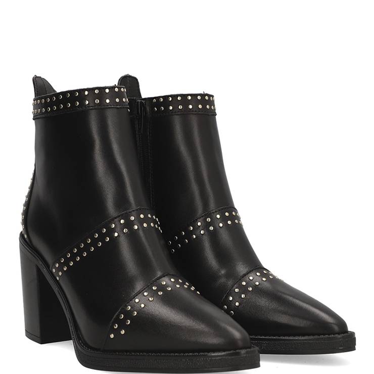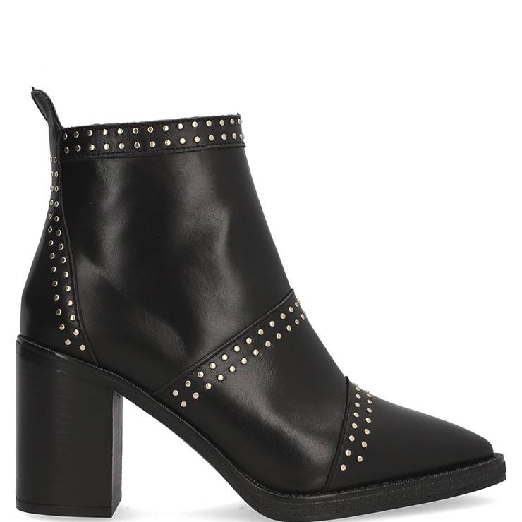 Botín de piel lisa. Detalle de mini tachuelas. Punta afilada. Tacón de 6 cm de altura. Cierre con cremallera lateral interna.