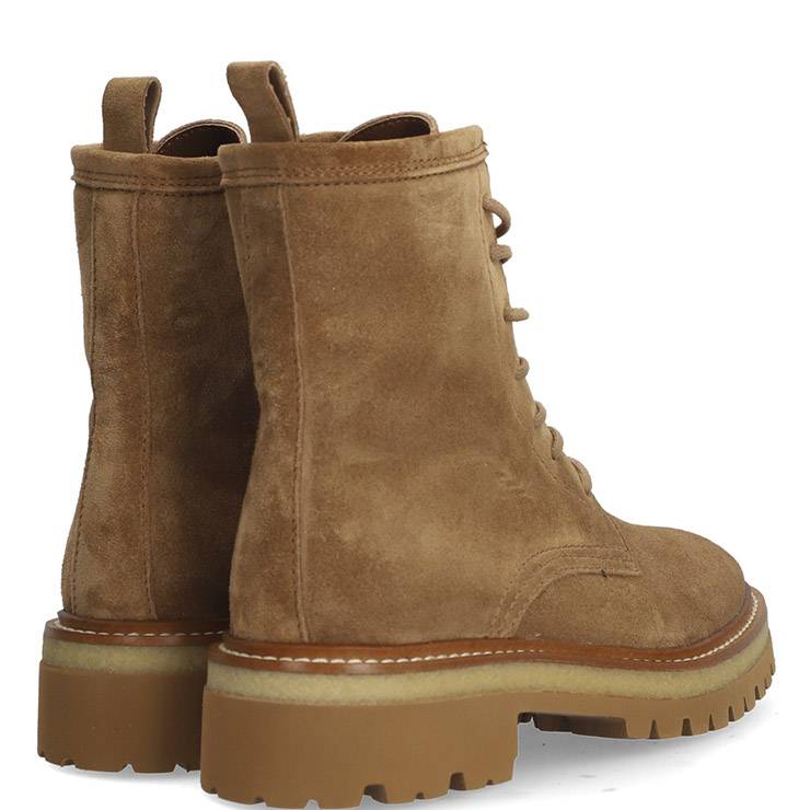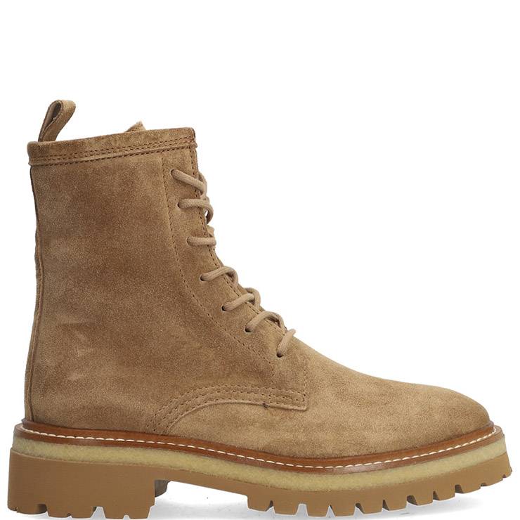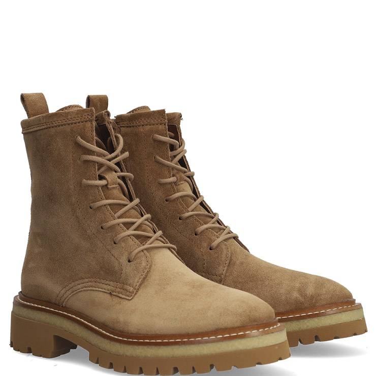 Botín elaborado en ante. Suela de goma con acabado crepé de 3 cm . Forro de piel sintética. Plantilla fija. Cierre con cordones y cremallera lateral interna.