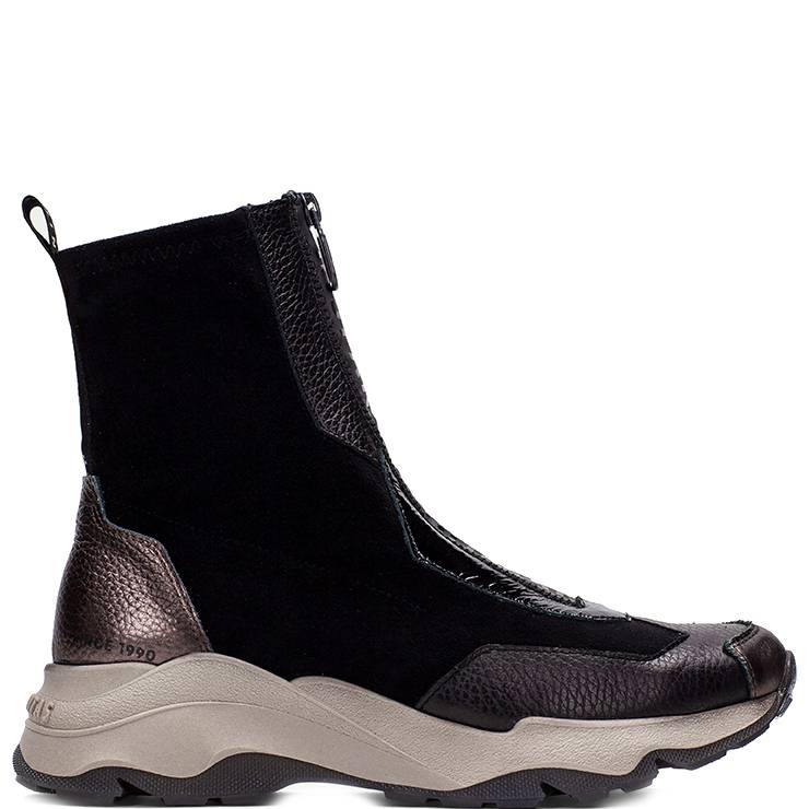 Botín deportivo elaborado en ante y piel. Suela de goma con cuña de 5 cm de altura. Cierre de cremallera en la parte frontal. Tirador trasero para facilitar el calce.