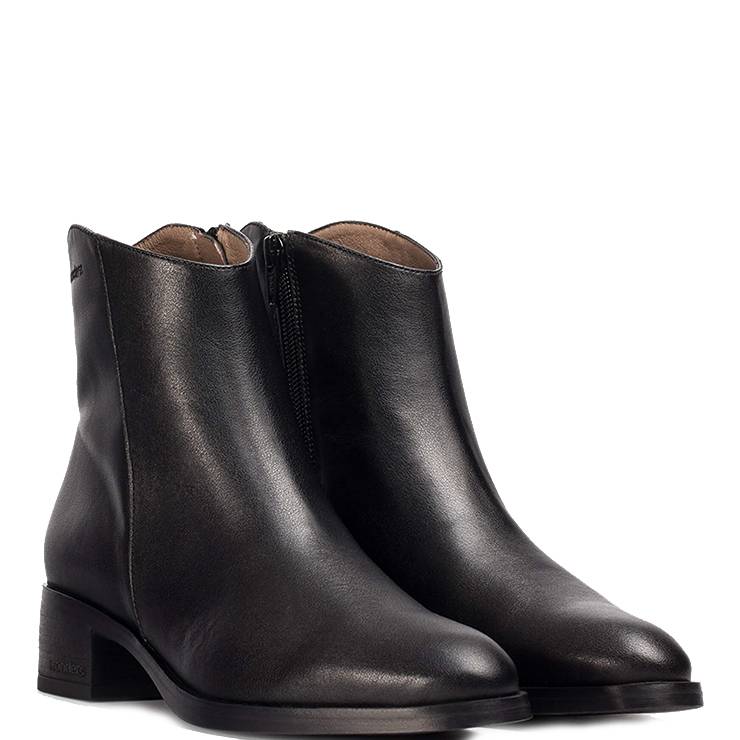 Botín elaborado en piel lisa. Caña baja y punta redonda. Cierre con cremallera lateral. Plantilla de MemoryGel. Suela de TPU con tacón de 4,5 cm de altura.