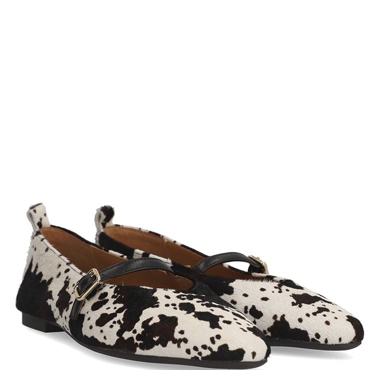 Merceditas elaboradas en pelo estampado. Suela antideslizante de 1 cm. Puntera afilada. Cierre con mini hebilla ajustable.