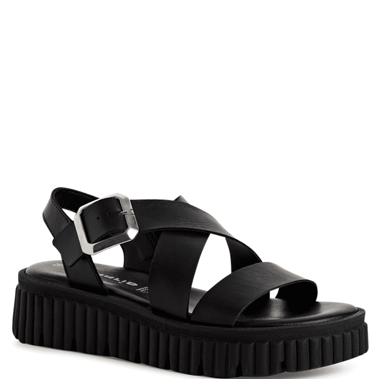 Sandalia plana con tiras anchas de piel. Cierre con hebilla. Suela de goma con plataforma de 4,5 cm de altura.