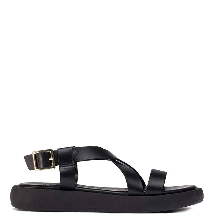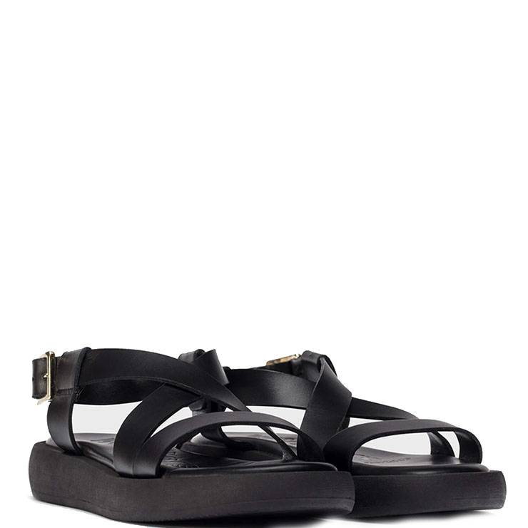 Sandalia planas elaboradas en piel lisa. Tiras entrelazadas simétricamente. Cierre con hebilla metálica. Plantilla interior de MemoryGel 3D. Suela TPU de 1,5 cm de altura.