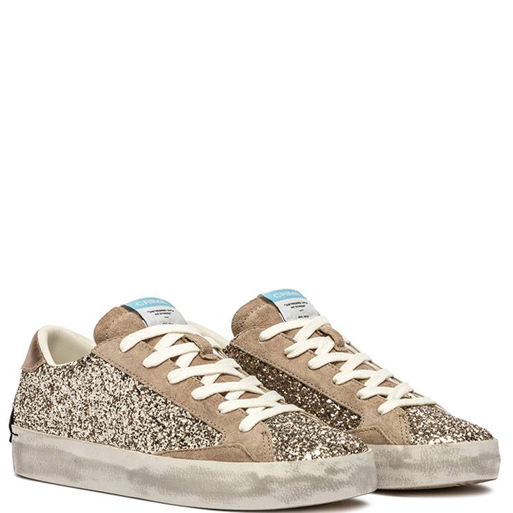 Zapatillas deportivas elaboradas en combinación de materiales como cuero, purpurina y ante. Parche de cuero en la parte posterior fijado con microtornillos. Cierre con cordones. Suela de foxing y ecopiel envejecida color marfil de 2,5 – 3 cm de altura.