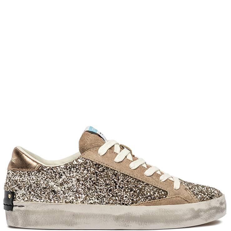 Zapatillas deportivas elaboradas en combinación de materiales como cuero, purpurina y ante. Parche de cuero en la parte posterior fijado con microtornillos. Cierre con cordones. Suela de foxing y ecopiel envejecida color marfil de 2,5 – 3 cm de altura.