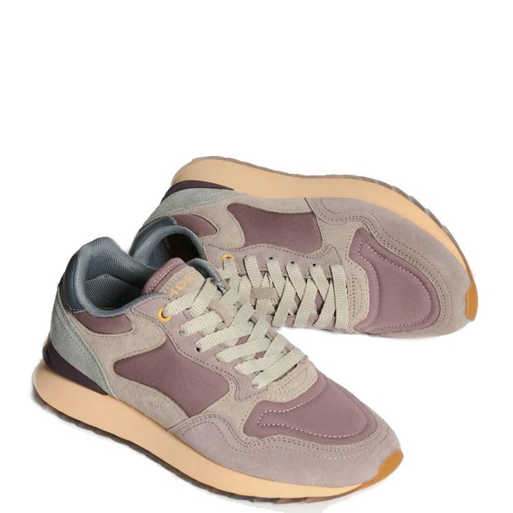Zapatillas deportivas con cordones formada por piezas cortadas combinando diferentes materiales en diferentes tonos pastel. Rejilla en poliéster transpirable. Plantilla extraíble de memory foam. Media suela de EVA de 3 cm de altura. Patín dentado en goma transparente con imagen serigrafiada.
