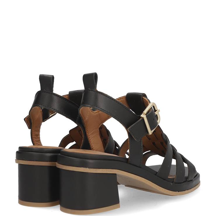 Sandalia de tacón elaborada en piel. Suela antideslizante con tacón de 5 cm de altura. Puntera cuadrada. Cierre mediante hebilla.