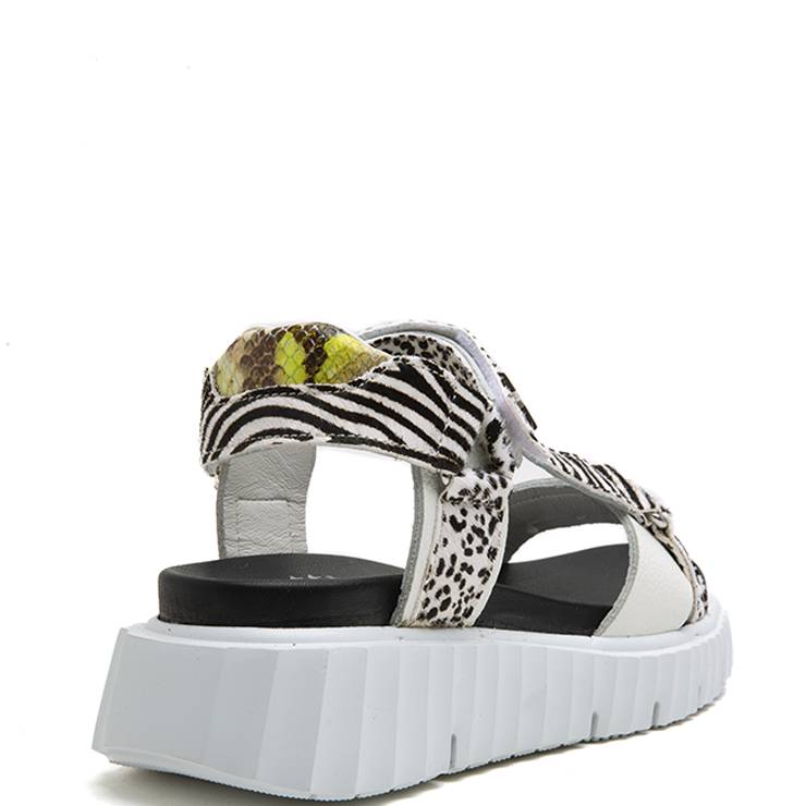 Sandalia de piel con tiras en combinación de materiales estampados en animal print. Cierre de velcro. Suela de goma deportiva de 3 cm.