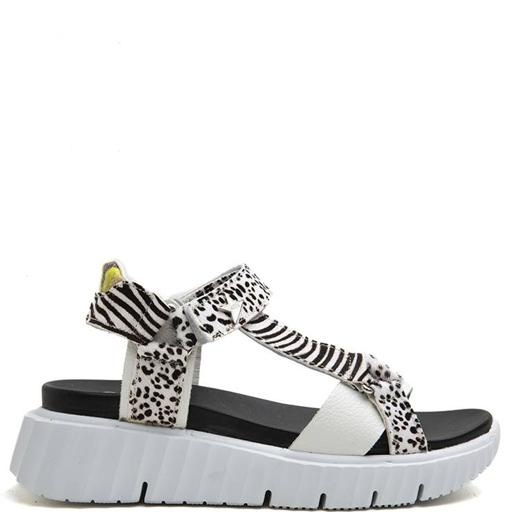 Sandalia de piel con tiras en combinación de materiales estampados en animal print. Cierre de velcro. Suela de goma deportiva de 3 cm.