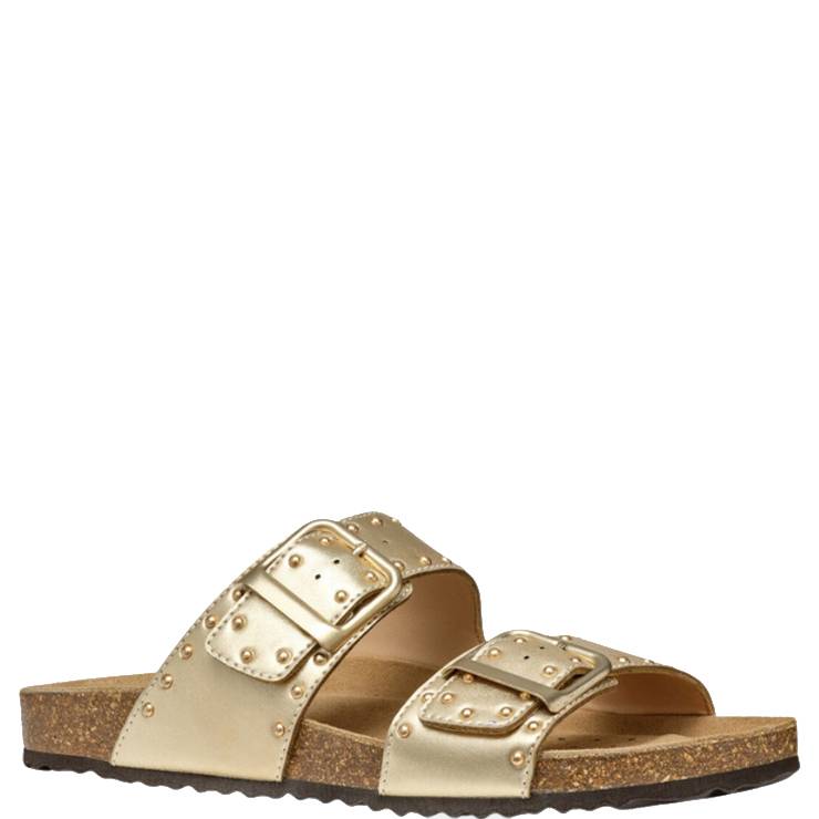 Sandalia elaborado en material efecto piel metalizada. Doble tira con hebilla. Detalle de mini tachuelas doradas. Suela de goma. Plantilla de piel. Tecnología Respira.