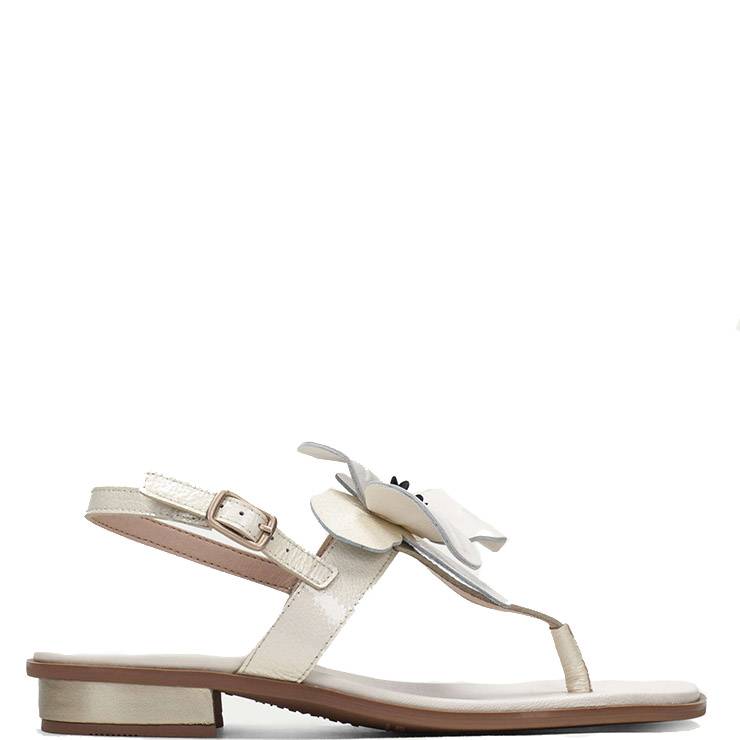 Sandalia plana tipo bikini en piel de bovino. Detalle de adorno de flor en el empeine. Tecnología Triflow de triple almohadillado. Suela de PU Termoplástico. Cómodo tacón ancho de 2,5 cm.