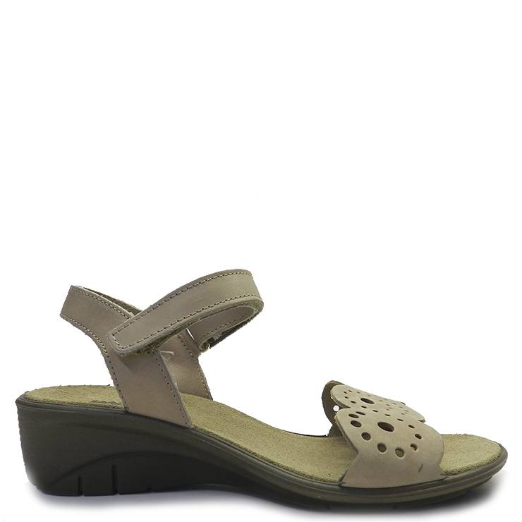 Sandalia de piel con pala con detalle perforado. Cierre ajustable con velcro a la altura del tobillo. Suela antideslizante con cuña de 4 cm. Suela anatómica de cuero.